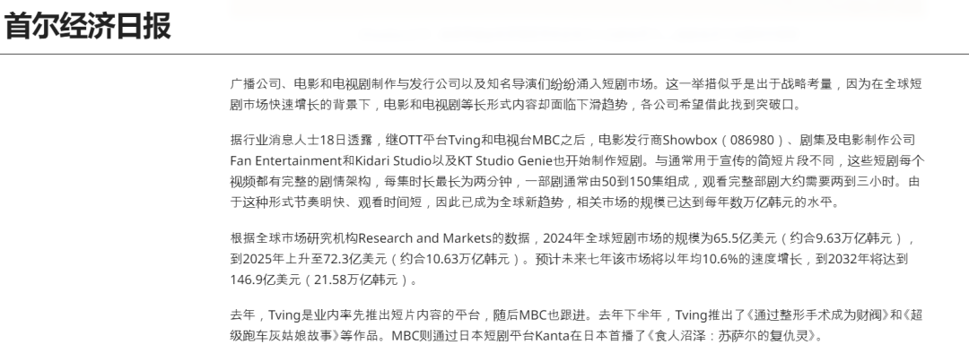 2026年2月,《首尔经济日报》报道称,韩国各大内容巨头正掀起一场“大举迁徙”,纷纷投身短剧制作。韩国知名电影发行制作公司Showbox、CJ ENM旗下流媒体平台Tving、韩国文化广播公司(MBC)、KT Studio Genie,以及韩国著名导演李俊益等获奖导演,都在全力转向竖屏微短剧。这个信号十分明确:这并非副业试水,而是韩国全球文娱攻势的下一个主战场。